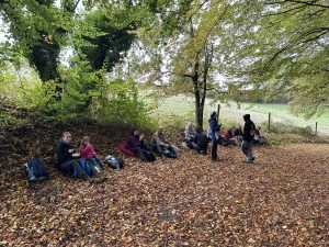[JN] Auch in diesem Jahr trafen wir uns wieder um 10 Uhr auf dem Dorfplatz in HapperschoĂ. Der 19. Oktober zeigte sich als windiger, kĂŒhler â aber immerhin trockener â Herbsttag. So machten sich 28 groĂe und zwei kleine Beine auf den Weg zur sportiven Wanderung. Nachdem sich die gesamte Wandergruppe auf dem groĂen Parkplatz der Sportanlage Seelscheid-Breitscheid eingefunden hatte, wurden wir herzlich vom WanderfĂŒhrer begrĂŒĂt. Frisch und munter starteten wir daraufhin unsere Tour durch den herbstlich gefĂ€rbten Wald. Der Weg schlĂ€ngelte sich bunt und abwechslungsreich an Deesem vorbei, langsam hinab ins idyllische Naafbachtal, dem wir danach eine ganze Weile folgten.